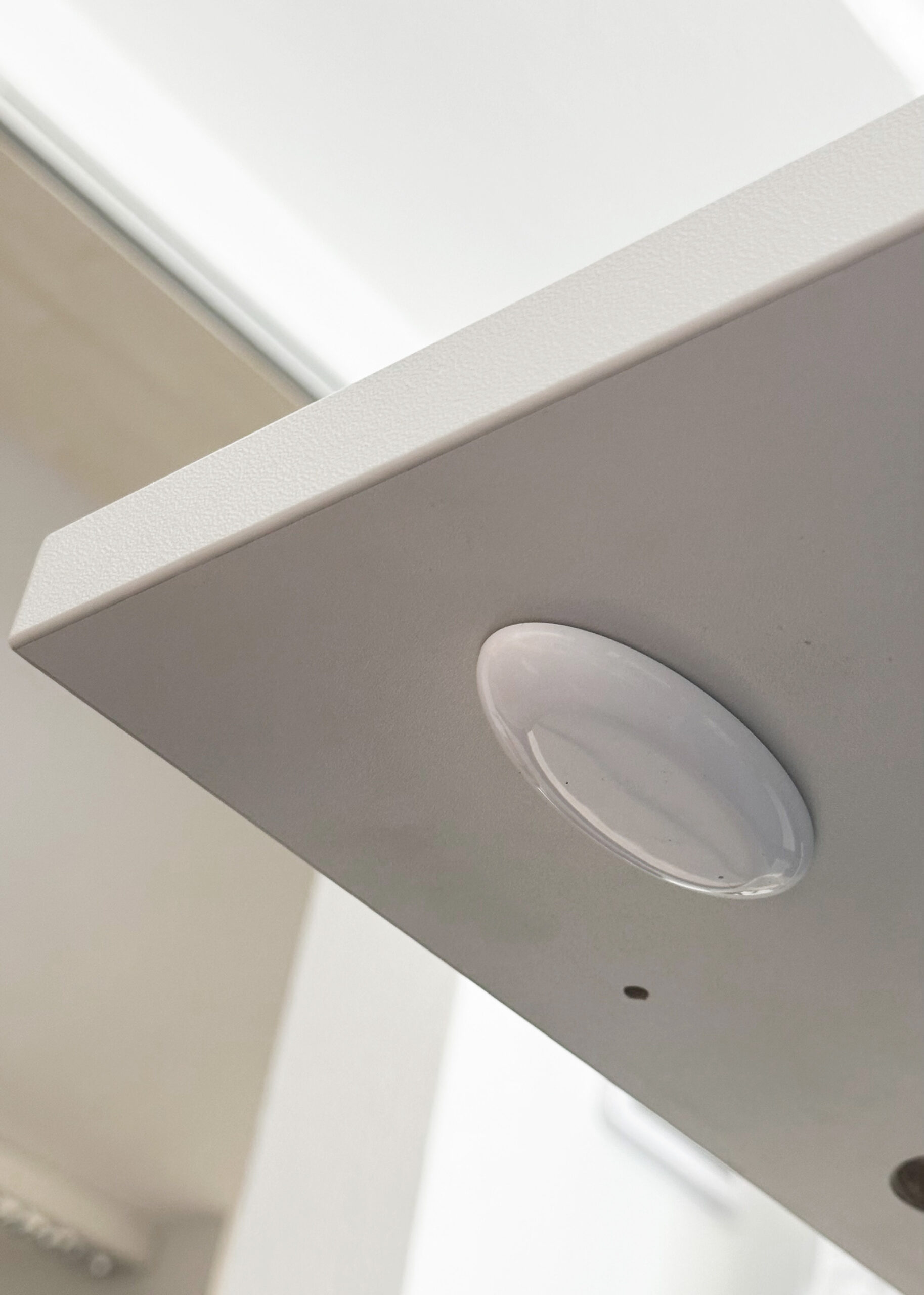 Die Fotos zeigen einen EnoSense® Desk VIB. Dieser kann wie hier gezeigt entweder auf oder auch unter einer Tischplatte montiert werden. Die Befestigung erfolgt mit dem bereits vorher am Sensor angebrachten doppelseitigen Klebepad.